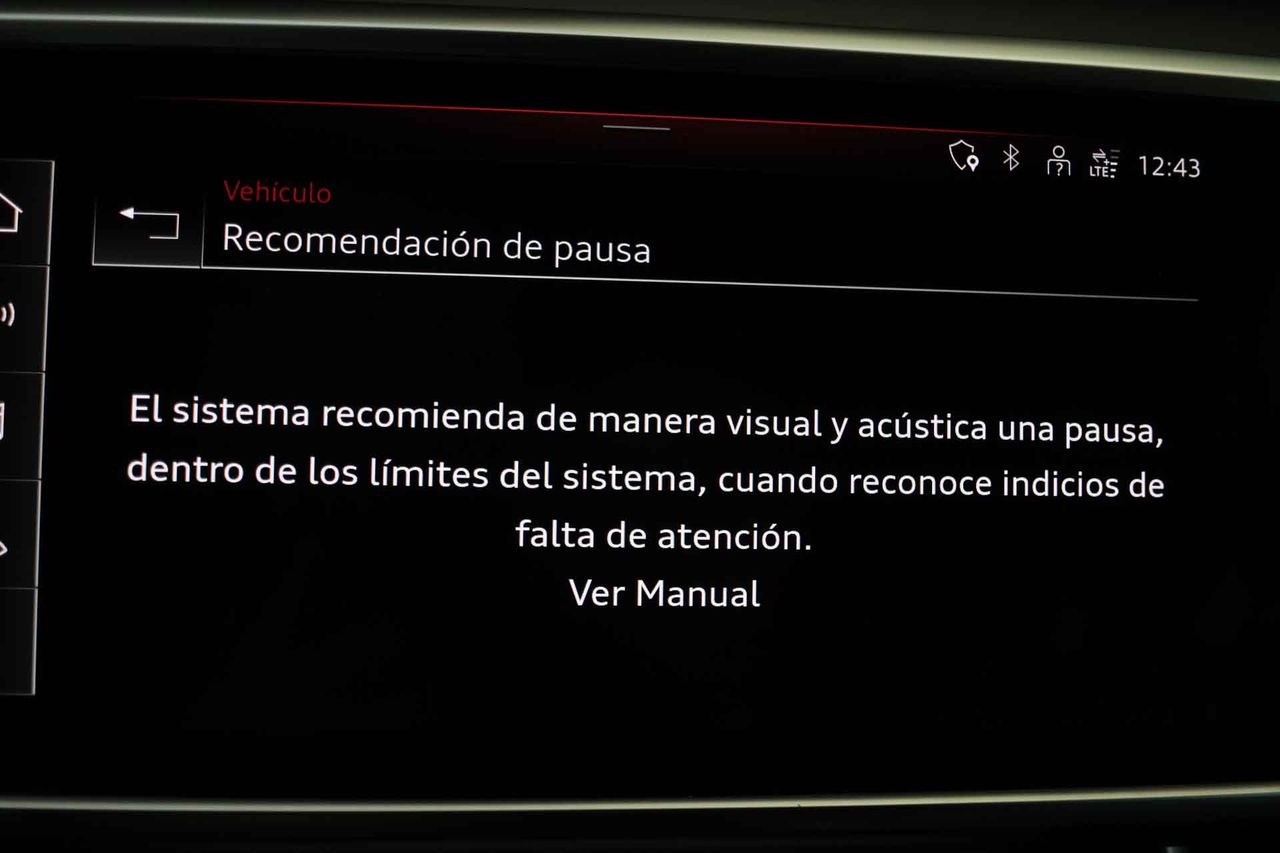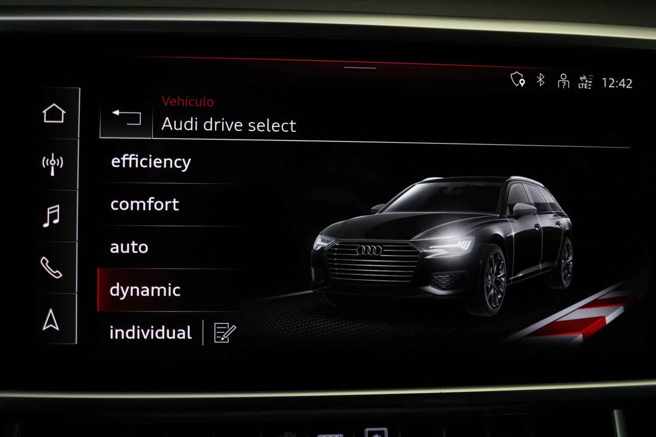 Airbag lateral de cortina delantero y trasero Airbag frontal del conductor inteligente, airbag frontal del acompañante desconectable y inteligente Airbags laterales delanteros Dos reposacabezas en asientos delanteros ajustables en altura, tres reposacabezas en asientos traseros ajustables en altura Cinturón de seguridad delantero en asiento conductor, acompañante y ajustable en altura con pretensores Cinturón de seguridad trasero en lado conductor, cinturón de seguridad trasero en lado acompañante, cinturón de seguridad trasero en asiento central de 3 puntos Preparación Isofix Resultado de pruebas de impacto Euro NCAP :, puntuación global: 5,00, protección adultos: 93,00, protección niños: 85,00, protección peatones: 81,00, puntuación ayudas a la seguridad: 76,00, Versión evaluada: Audi A6 40 TDI Sportline SA y Fecha del test: 01 sep 2018 Sistema de alarma de colisión: activa los cinturones de seguridad y las luces de freno con asistencia de frenado, monitorización del conductor y frenado a baja velocidad aviso visual/ acústico Alerta de cambio de carril: activa la dirección Apertura compartimiento motor Sistema de frenado anti-multicolisión Seis airbags Conducción autónoma 1 y control de carril activo Sistemas eléctricos e híbridos